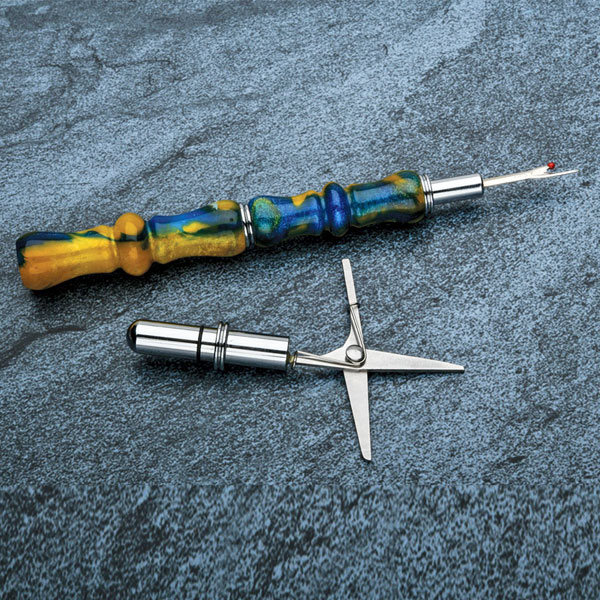 A seam ripper with mini scissors creates a handy combination. The seam ripper tucks safely into the turned tube on one end and the scissors are on the other.—Deluxe small Seam Ripper blade.