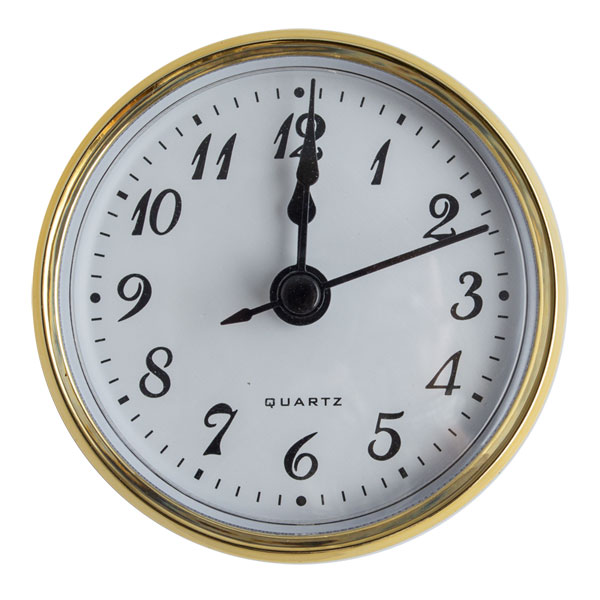 70mm/2.75" Clock - Gold - White Arabic Each quartz clock insert features a solid metal case plus a real glass lens.