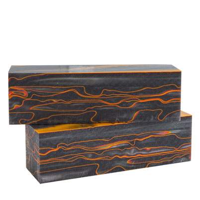 For ease of turning, Acrylic Acetate is hard to beat. The 1.5 x 1.5 x 5" Midnight Racer spindle is an orange and yellow stripe screaming through a field of charcoal grey. The contrast of the colors in the background that races from black to silver is breathtaking. Spindles are perfect for your mid-sized projects such as ice cream scoops, bottle stopper/openers, ornaments or duck calls.