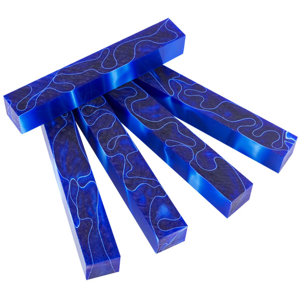 Blue Ripples is a translucent blue blank with a ribbon of white running through the blank. It is a great color combination. For ease of turning, Acrylic Acetate is hard to beat.