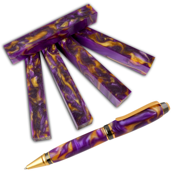 #51 Regal Swirl is just what the name says - Regal! It is made up of shades of purple with yellow-gold swirls throughout! Acrylic Acetate turns easily and polishes extremely well. All blanks are 3/4" square x 5" long.