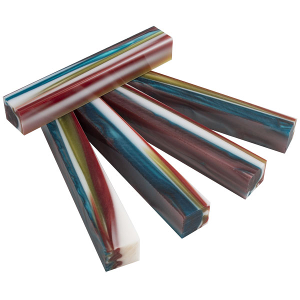 Acrylic Acetate #56 - Dragonfly is made up of random strips white, purple, teal, burgundy and green! Acrylic Acetate turns easily and polishes extremely well.