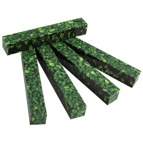 Acrylic Acetate #57 - Forest Green is made up of shades of green chips with a black base! Acrylic Acetate turns easily and polishes extremely well. All blanks are 3/4" square x 5" long.