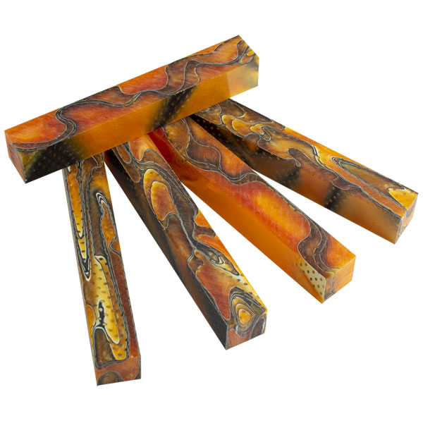 Orange Mesh is made up of beautiful shades of orange and yellow with a white perforated mesh rolling through the blank that serves to lighten or darken depending on how close or far the orange is from the white. The ease of turning Acrylic Acetate is hard to beat.