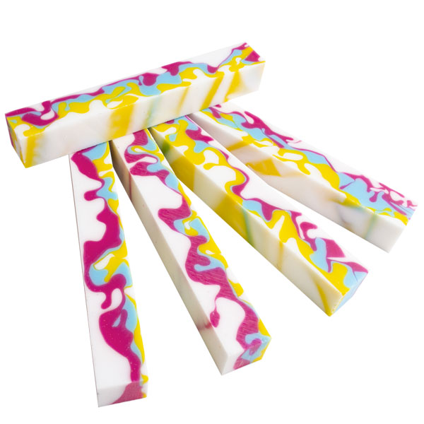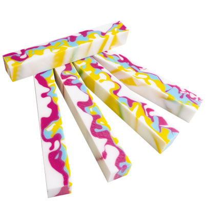 Pastel Camo is made up of pink, blue, and yellow rolling throughout a white pen blank. The ease of turning Acrylic Acetate is hard to beat!