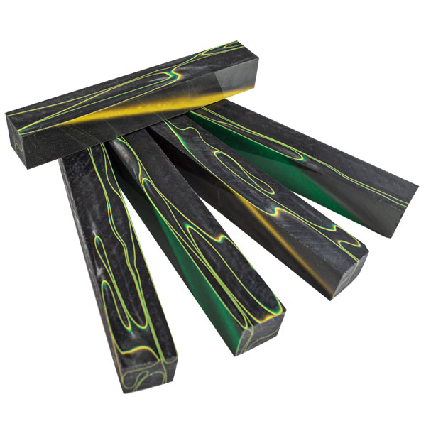Overdrive Acrylic Acetate pen blank is made up of yellow, green rolling throughout the black with silver highlights. The ease of turning Acrylic Acetate is hard to beat!