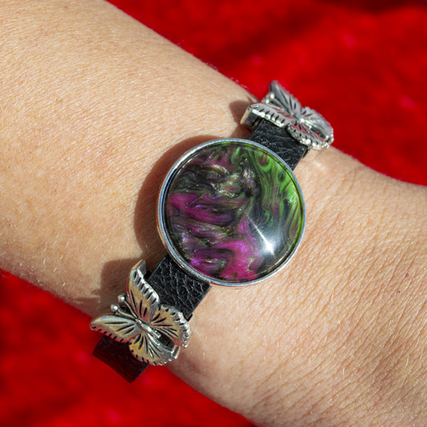 These leatherette bracelets are a nice way to combine your artwork with your favorite accent along the sides. They are about 7.5" from clasp to end of the strap. Then, there is a 2" extension chain on the end for adjustments.