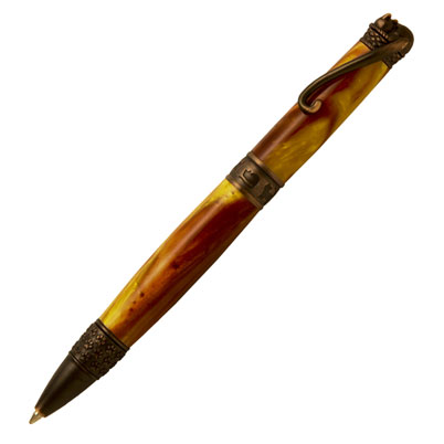 Perfect for cat lovers... a reminder of your furry friend to carry with you! This pen has lots of details to do just that! The top is cast into the shape of a cat lounging in a weaved basket with her stylized tail extending down forming the spring clip. Helping to complete the look, there are paw prints engraved around the bottom of the pen. Additionally, there are cats in various poses surrounding the center band. This kit uses a Parker-style refill.