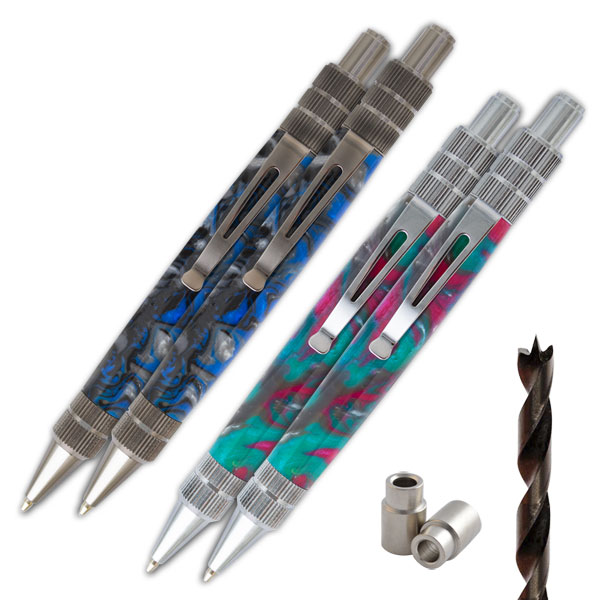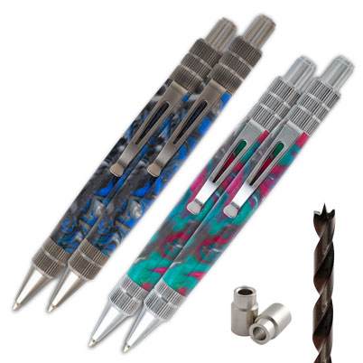 • If your preference is a click pen, the Clever Click Pen Kit will be a sure favorite! With its modern design, and vertical knurling at the top and bottom; it leaves plenty of barrel area to show off your turning skills. This WoodTurningz Exclusive click pen turns easily and presses quickly. The Clever Click pen kit is an excellent EDC pen but has enough sizzle to be a collector’s showpiece as well. Select your favorite Inlace Acrylester or wood pen blank and craft a masterpiece as this pen really shows off a special blank.