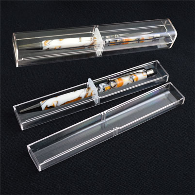 This crystal clear pen box will fit any pen .30 cal bullet pen size and smaller. The barrel may not exceed 1/2" in diameter and the pen should not exceed 5 1/2" in length. Box Dimensions are: 6" x 1" x 3/4".