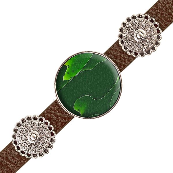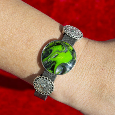 These leatherette bracelets are a nice way to combine your artwork with your favorite accent along the sides. They are about 7.5" from clasp to end of the strap. Then, there is a 2" extension chain on the end for adjustments.