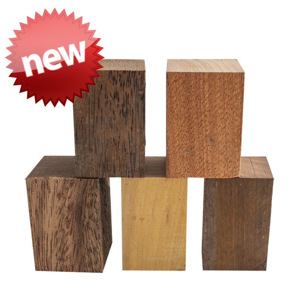 Exotic Wood Bottle Stopper 5-pack includes 1 ea of the following woods: Red Canary, Red Palm, Chechen, Satinwood & Bhilwara(1.5" square x 2.25" long)