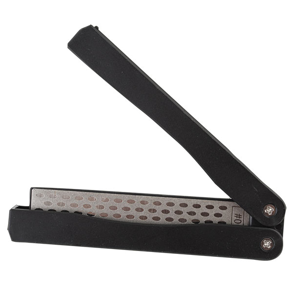 This hand sharpener is a handy little gadget! It is 2-sided and has both coarse and fine grits. It is ideal for sharpening knives, scissors, chisels, and all cutting edges. **Folds into the protective cover.
