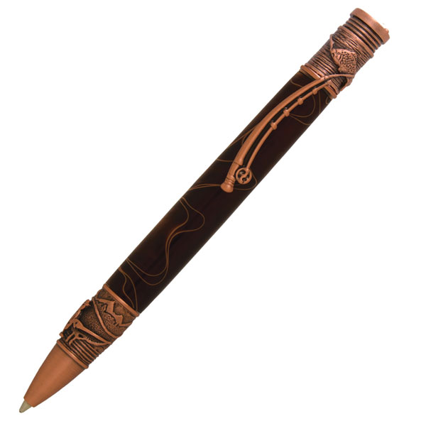 The Fly Fishing Antique Copper Twist Pen Kit is perfect for anyone who has a love for this sport. The pen clip features the reel with an engraved trout in line wrapping around the pen top. The pen tip features an outdoor scene of a fisherman casting his line. This is a 3/8" single barrelled kit and is easy-to-make!