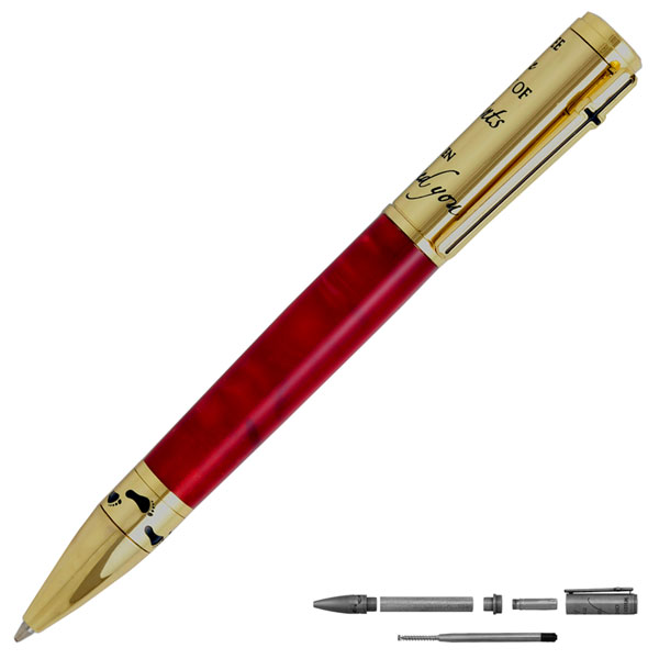 Drawing inspiration from the profound religious saying, "When you see only one set of footprints, it was then I carried you," this remarkable Footprints in the Sand Pen Kit captures the essence of that cherished verse. The pen's top intricately portrays footprints fading into the horizon, accompanied by tranquil ocean waves. The upper tube showcases a timeless excerpt from the poem, elegantly crafted in graceful calligraphy. Adding a touch of reverence, the pen clip features a tastefully placed Cross beside the poetic verse. Finally, the pen tip bears a single set of footprints etched in the sand. This exceptional pen includes a smooth-writing Parker-style refill, ensuring a pleasurable writing experience.