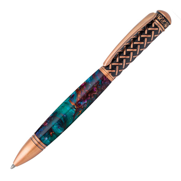 The Gaelic Weave twist pen has a very classy look! It is available in 6 finishes and each accented with black enamel. This single-blank kit is easy to turn and makes a very elegant pen. Blank size 3/4" square x 2.5" long.