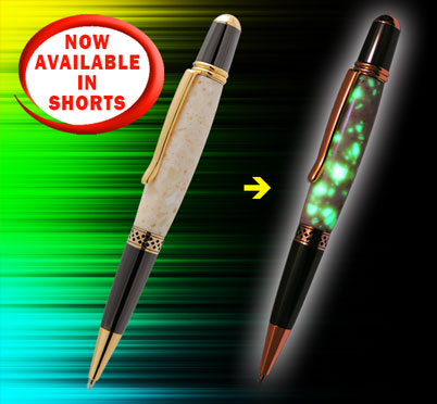 Afraid of the dark? Don’t be! Create and carry your own glow-in-the-dark pen exclusively from WoodTurningz’ line of Glow Stonez pen blanks. Turn this glow-in-the-dark acrylic-simulated stone blank as you would any acrylic blank using sharp tools. Assemble your pen and watch it cast a green glimmer in the dark!