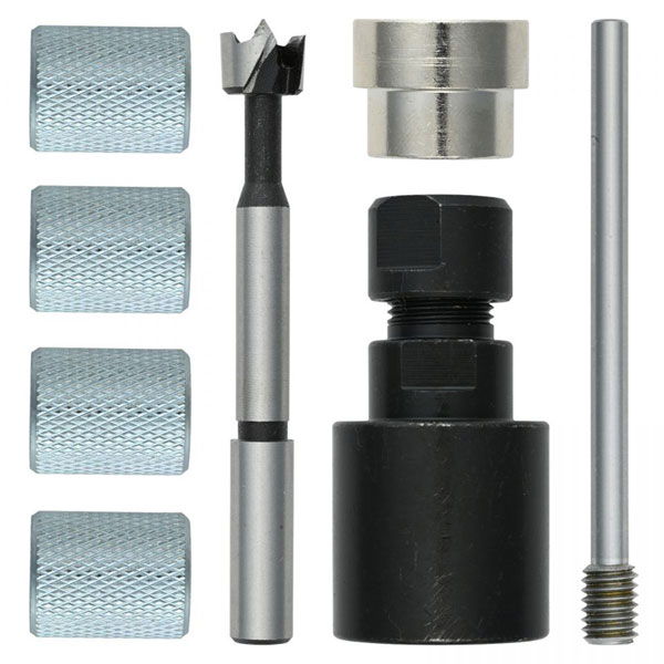 Set includes: bottle stopper chuck with collet and closer, 3/8" x 16 mandrel rod, bushings for .80" and .959" diameters, 1/2" Forstner bit, and four #BSERT 3/8" threaded inserts.