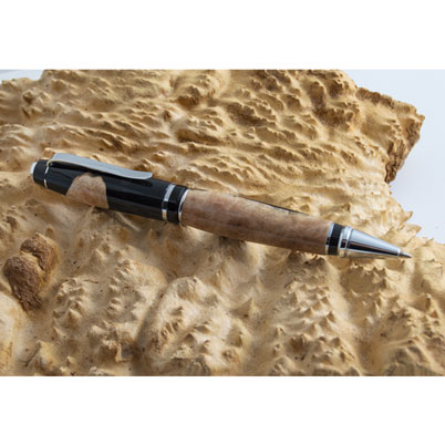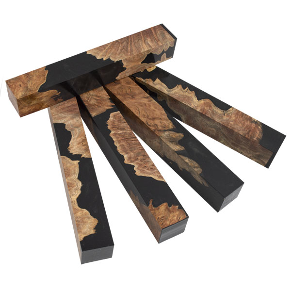This Hybridz blank in black is meticulously hand-crafted from Australian Mallee Burl and cast in an opaque-colored Alumilite resin. The high-pressure process penetrates the pores and voids in the burl. You’ll find these blanks easy-to-turn as this special type of resin limits chip out. No two blanks are alike. For best results, finish with CA glue. (Note: As with most burls some small voids my need to be filled with CA glue.)