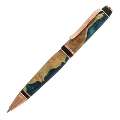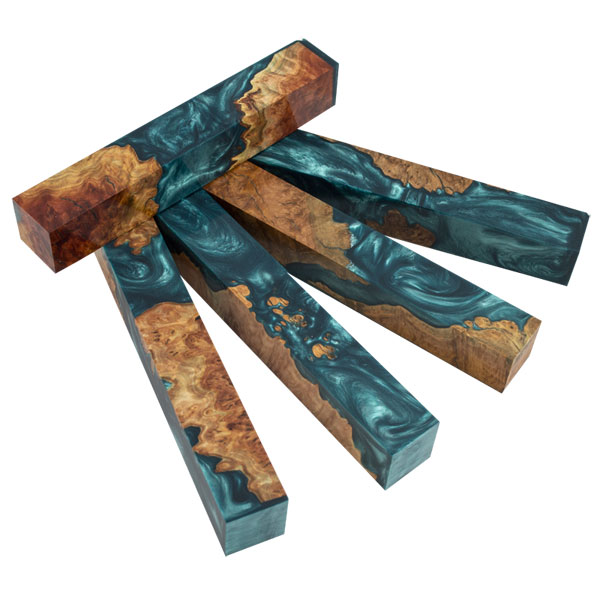 This Hybridz blank in green is meticulously hand-crafted from Australian Mallee Burl and cast in an opaque-colored Alumilite resin. The high-pressure process penetrates the pores and voids in the burl. You’ll find these blanks easy-to-turn as this special type of resin limits chip out. No two blanks are alike. For best results, finish with CA glue. (Note: As with most burls some small voids may need to be filled with CA glue.)