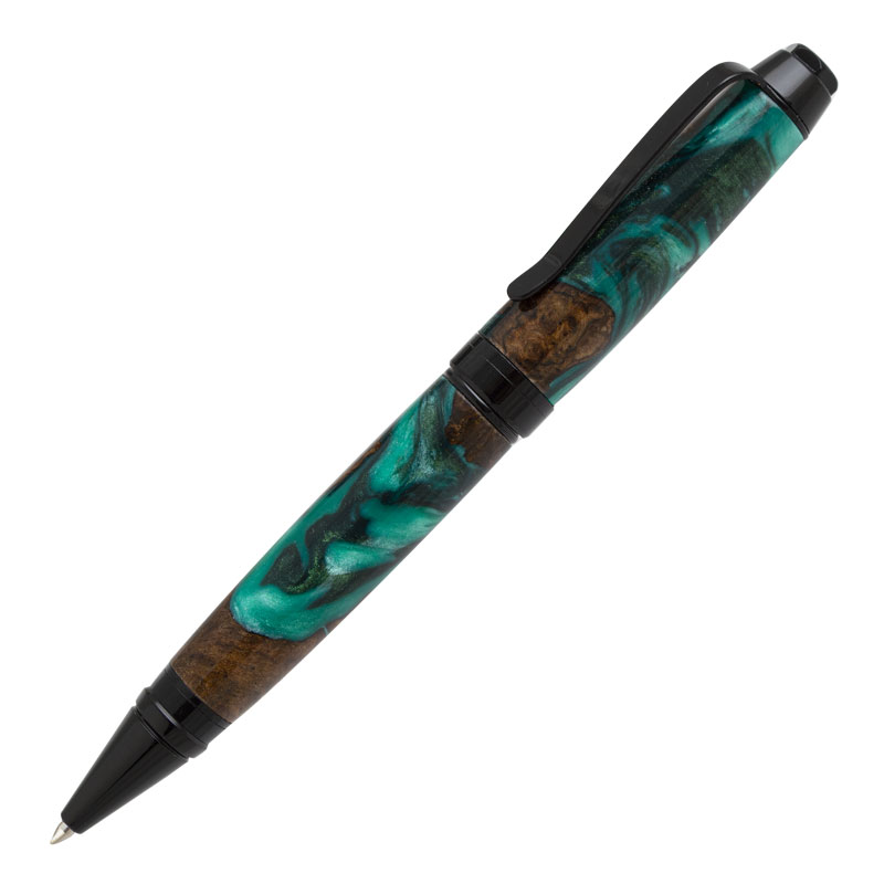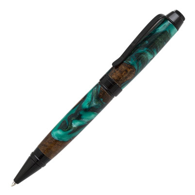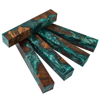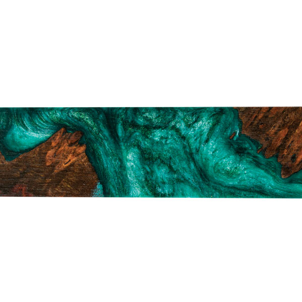 This new Hybridz blank is cast in two shades of green which enhances its depth and beauty! Meticulously hand-crafted from stabilized Chechen Burl, this blank is cast in two shades of green pearl Alumilite resin. The casting process penetrates the pores and most voids in the burl making these blanks easy-to-turn as this special resin limits chip out. No two blanks are alike. For best results, finish with CA glue. (Note: As with most burls some small voids may need to be filled with CA glue.)