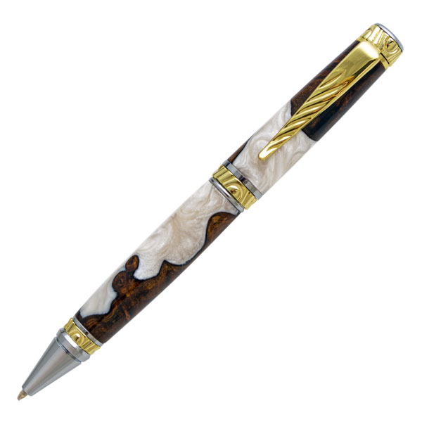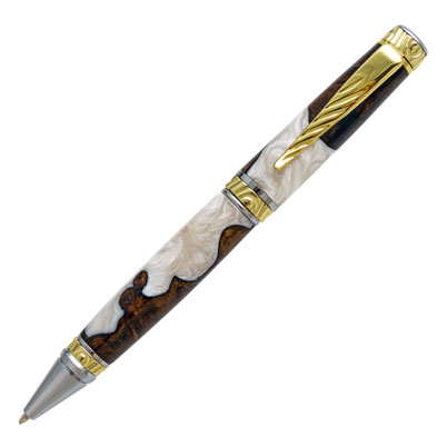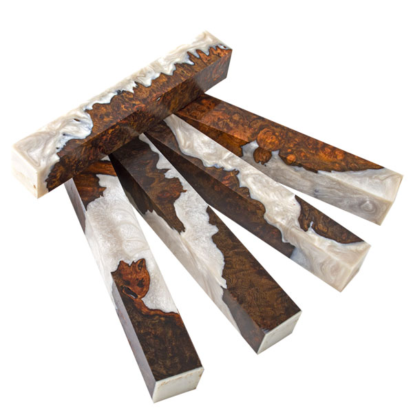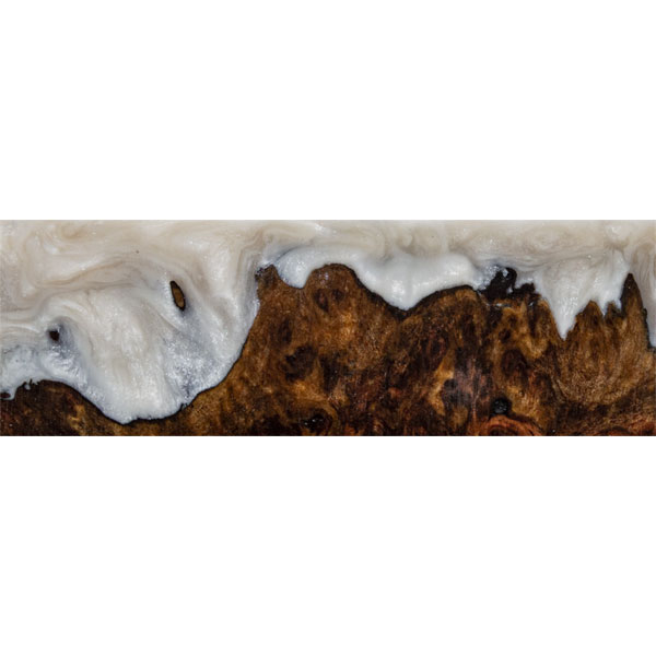 This new Hybridz blank is cast in two shades of the white which enhances its depth and beauty! Meticulously hand-crafted from stabilized Chechen Burl, this blank is cast in two shades of white pearl Alumilite resin. The casting process penetrates the pores and most voids in the burl making these blanks easy-to-turn as this special resin limits chip out. No two blanks are alike. For best results, finish with CA glue. (Note: As with most burls some small voids may need to be filled with CA glue.)