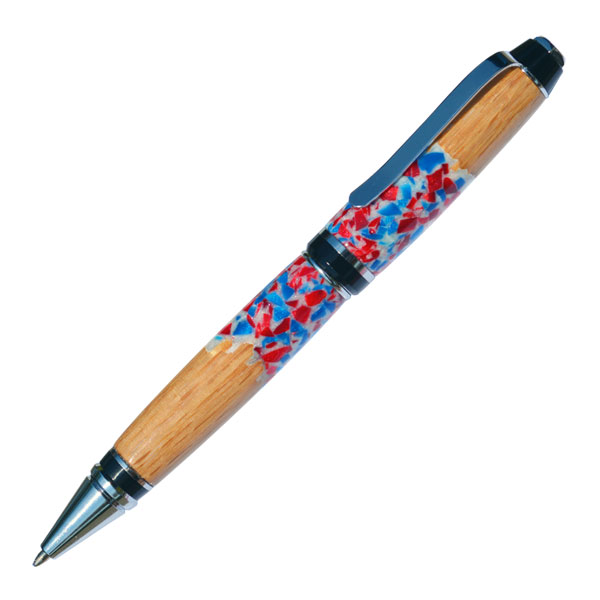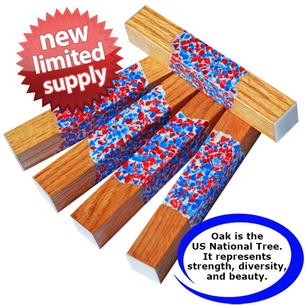 The New Patriotic Fractured Red Oak Hybridz blank has "one-of-a-kind" written all over it! This stunning blank features a captivating mix of blue and red granules set in a white base, meticulously hand-crafted from stabilized Red Oak and cast in sparkling Alumilite pearl resin.