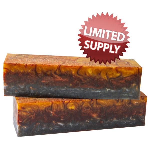 WBIAXX31 Molten Core is a limited batch spindle blank. This color is composed of gold, bronze, and silver swirls. We only have a limited supply. WoodTurningz is proud to manufacture Inlace Acrylester Blanks! Size is 1-1/2" square by 6" long