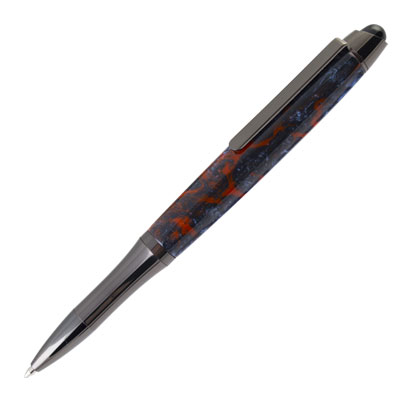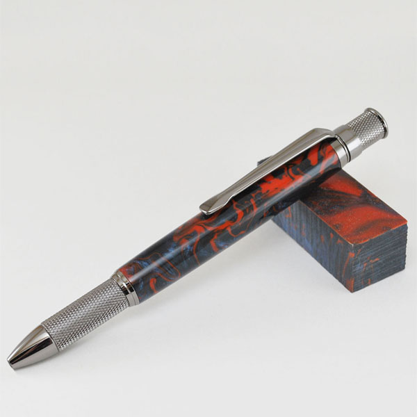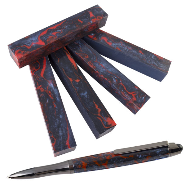 WoodTurningz is proud to manufacture Inlace Acrylester Blanks! Coral Tide is a striking combination of dark silver, navy blue, and coral orange swirls! Blanks are 3/4" square by 5" long.