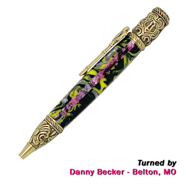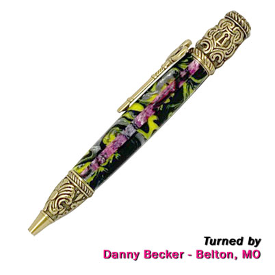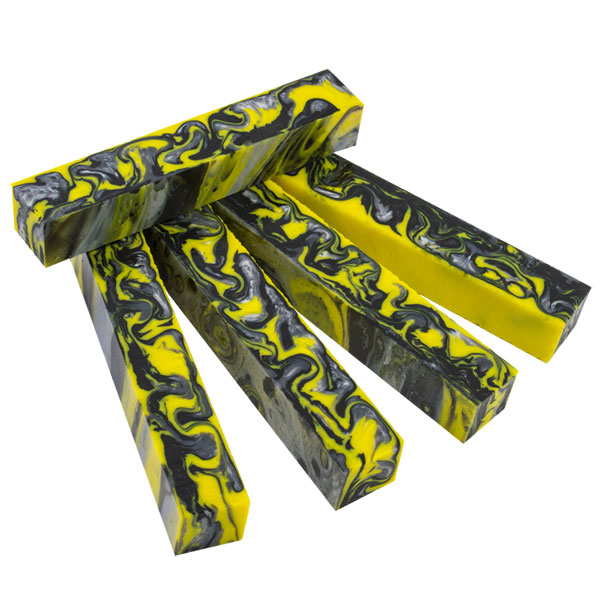 Inlace Acrylester #124 - Yellow Damascus is made up of black, yellow, and silver swirls. It is a great blend of colors that are perfect for anyone! Blanks are sized at 3/4" x 3/4" x 5 1/4".