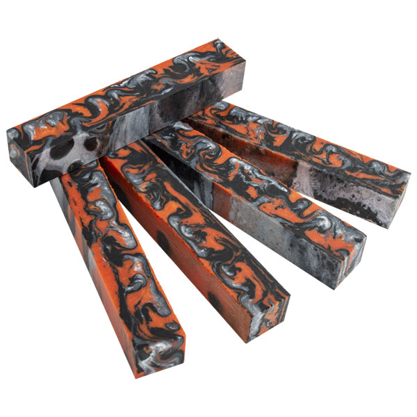 Inlace Acrylester #125 - Orange Damascus is made up of black, orange, and silver swirls. It is a great blend of colors that are perfect for anyone! Blanks are sized at 3/4" x 3/4" x 5".