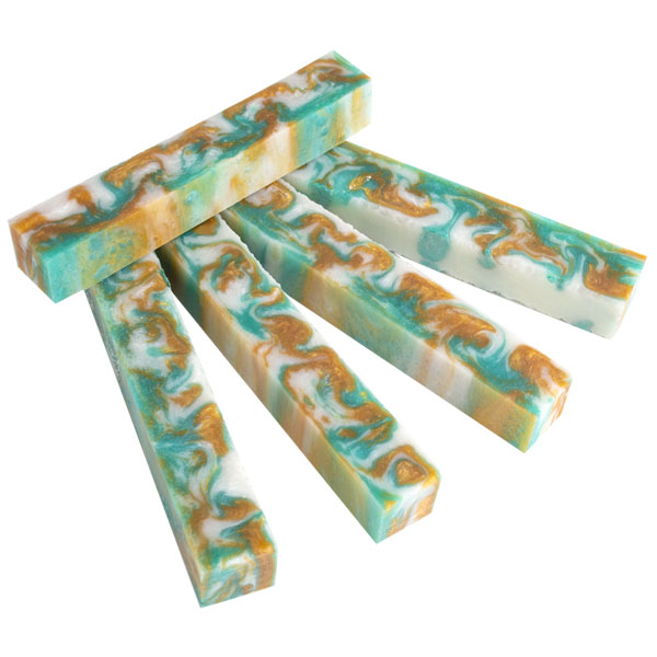 Inlace Acrylester #128 - Beachcomber is made up of teal blue-green, white, and metallic gold swirls. It is a really nice mix of colors that are a perfect blend! Blanks are sized at 3/4" x 3/4" x 5".