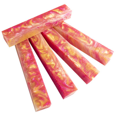 Inlace Acrylester #134 - Strawberry Lemonade is made up of pink, white pearl, and gold swirls. WoodTurningz is proud to manufacture Inlace Acrylester Blanks! These pearlescent blanks look incredible when finished and have amazing depth when viewed in the light!