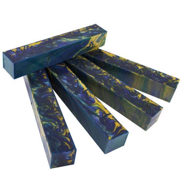 Inlace Acrylester #139 - Blue Lagoon is a really dynamic color made up of dark blue, teal blue, green, and yellow swirls. WoodTurningz is proud to manufacture Inlace Acrylester Blanks! These pearlescent blanks look incredible when finished and have amazing depth when viewed in the light!