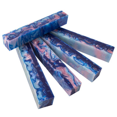 Inlace Acrylester #140 - Hydrangea is a really dynamic color made up of royal blue, light blue, and light pink swirls. WoodTurningz is proud to manufacture Inlace Acrylester Blanks! These pearlescent blanks look incredible when finished and have amazing depth when viewed in the light!