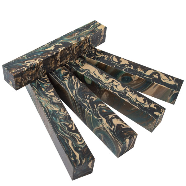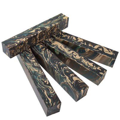Inlace Acrylester #142 - Commando is an awesome color made up of desert tan, dark jade green, and pearlescent brownish bronze swirls. Great for military and hunting enthusiasts. WoodTurningz is proud to manufacture Inlace Acrylester Blanks! These blanks look incredible when finished and have amazing depth when viewed in the light! Blanks are sized at 3/4" x 3/4" x 5".
