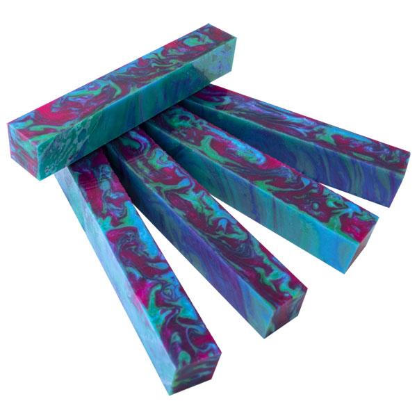 Inlace Acrylester #143 - Parrotfish is a beautiful, festive color made up of aqua blue, green, and fuchsia swirls. WoodTurningz is proud to manufacture Inlace Acrylester Blanks! These blanks look incredible when finished and have amazing depth when viewed in the light! Blanks are sized at 3/4" x 3/4" x 5".