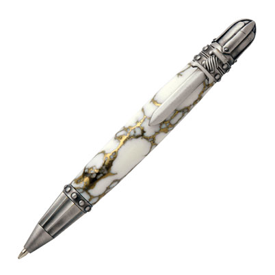 If you like knights, soldiers, kings or are just a fan of medieval history, then this pen kit is for you! The meticulously handcrafted components feature period armor adornment including a medieval sword, a hand riveted replica knights helmet with a dome recess on the end, plus a fluted armor design on the pen tip. Easy to make with a single 3/8in. tube and provides smooth writing performance with a Parker style refill. Plus, the Antique Pewter finish is formulated to simulate the sophisticated sheen of time-worn pewter. The authentic patina and natural darkening brings out the details of the finish and creates a unique feel with a charm all its own.
