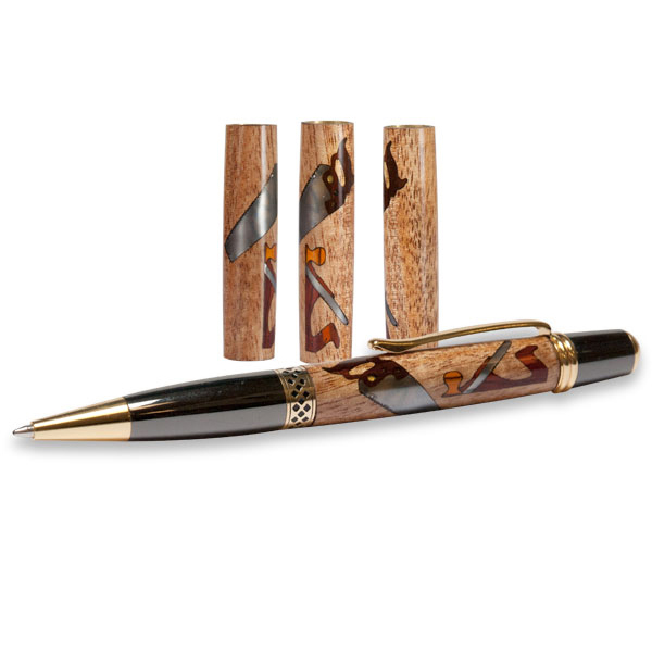 The Woodworkers Inlay Kit is made up of Metallic Silver Acrylic, Cocobolo, and Koa. A total of 7 pieces. It has been designed to fit the Mesa and Magnetic Vertex (PKFP5XXX) Pen Kits. Just follow the included directions, glue and turn!