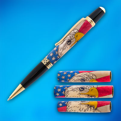The American Eagle Laser Inlay Kit is for the Mesa and Vertex (PKFP5XXX) pen kits! This kit has 27 pieces which are made from Holly, Yellow Cedar, and black, red, yellow and blue-dyed Basswoods. Just follow the included directions, glue and turn!