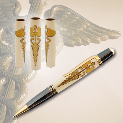 The Caduceus Symbol serves as a reminder of the power of healing and the dedication of those who work tirelessly in the healthcare field. This precision cut laser blank kit turns a Mesa Pen Kit into an exceptional gift for doctors, nurses, medical students, or anyone involved in the medical profession. It's also a thoughtful gesture to show appreciation for their noble and compassionate service. The metallic gold caduceus wraps around the barrel of the pen. There are 11 Holly pieces and 3 gold Acrylic pieces. It has been designed to fit the Mesa and Magnetic Vertex (PKFP5XXX) Pen Kits. Just follow the included directions, glue and turn!
