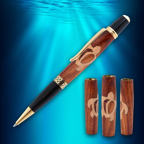 The Honu Turtle laser inlay kit is now available for the Mesa or Vertex (PKFP5xxx) pen kits! This easy-to-make kit has only 4 pieces which are made from Hawaiian Koa and Maple. Just follow the included directions, glue and turn!