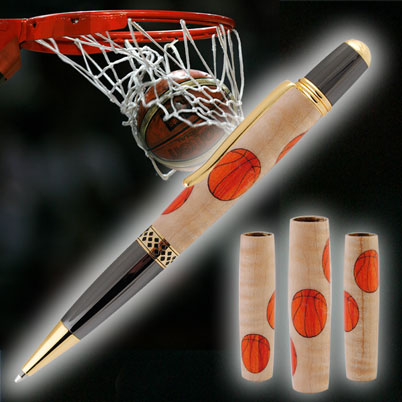 Give the Basketball Laser Inlay Kit a try! This kit is made from Curly Maple and has 3 pieces of orange-dyed Basswood. It has been designed to fit the Mesa and Magnetic Vertex (PKFP5XXX) Pen Kits. Just follow the included directions, glue and turn!