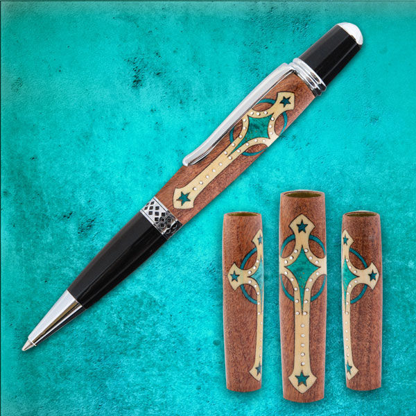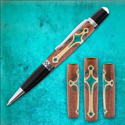This beautiful Western Cross Laser Inlay Kit is made up of 17 pieces including Mesquite, Turquoise dyed Box elder burl, Turquoise dyed Basswood and Sterling Silver wire. It has been designed to fit the Mesa and Magnetic Vertex (PKFP5XXX) Pen Kits. Just follow the included directions, glue and turn!