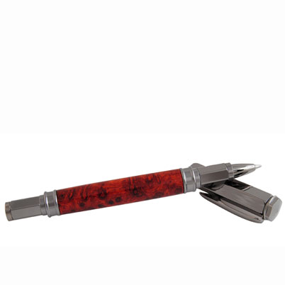 With hexagonal styling the Vertex kit is both functional and beautiful. The click pen uses a 3/8" drill bit and has a single press in cartridge that is smooth as silk. The rollerball and fountain pen versions have a convenient and stylish magnetic cap that can be used to cover the writing end, or post on the back end of the pen. The magnetic cap makes threads obsolete and increases convenience. The magnetic version uses a 10.5mm drill bit.
