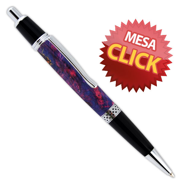 This is the Mesa click pen in Chrome!! If your preference is a click pen, then this will soon be your favorite chrome click pen!! (Uses 27/64" drill bit and PKMESABU bushings) Blank size under 3" x 3/4" square.