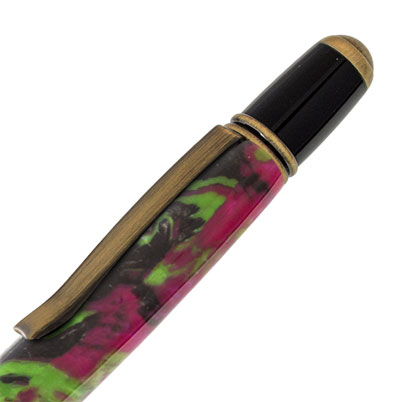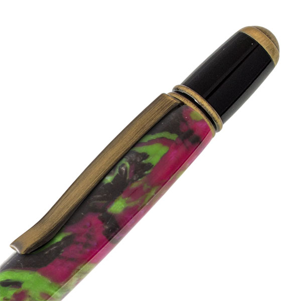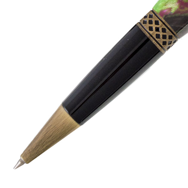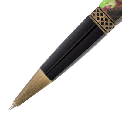 This one-piece twist pen is similar in styling to the Sierra & Gatsby, the lower band has rows of inlaid black diamond shapes. This is a really elegant and intricate-looking pen comes in Antique Brass, but is available in multiple finishes. (Uses 27/64" drill bit)