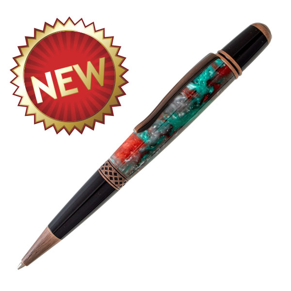 This one-piece twist pen is similar in styling to the Sierra & Gatsby, the lower band has rows of inlaid black diamond shapes. This is a really elegant and intricate-looking pen comes in Antique Copper, but is available in multiple finishes. (Uses 27/64" drill bit)