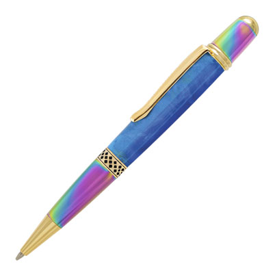 This one-piece twist pen is similar in styling to the Sierra & Gatsby, the lower band has rows of inlaid black diamond shapes. This is a really elegant and intricate-looking pen comes in the 24kt gold and multi-color, but is available in multiple finishes.