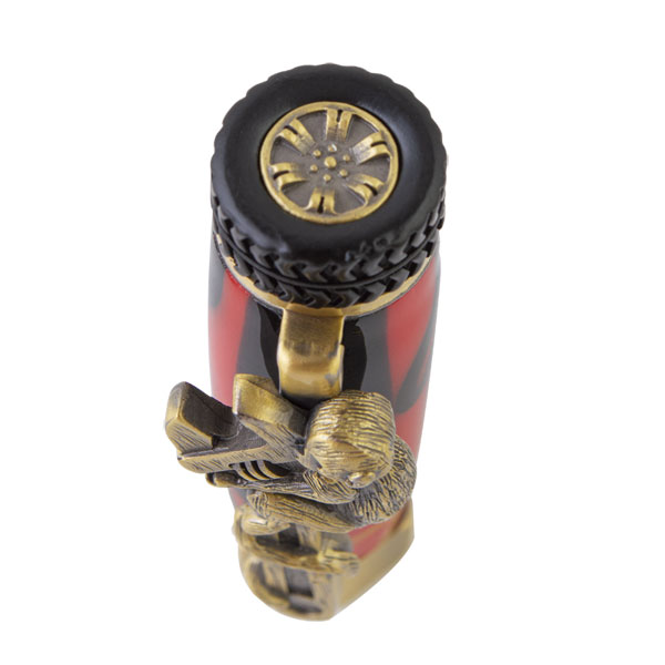 The theme starts with a tire on top, a monkey and wrench for the clip and finishes with a bolt as the centerband. The cap posts on the rear of the pen which features wide threads to prevent cross-threading.